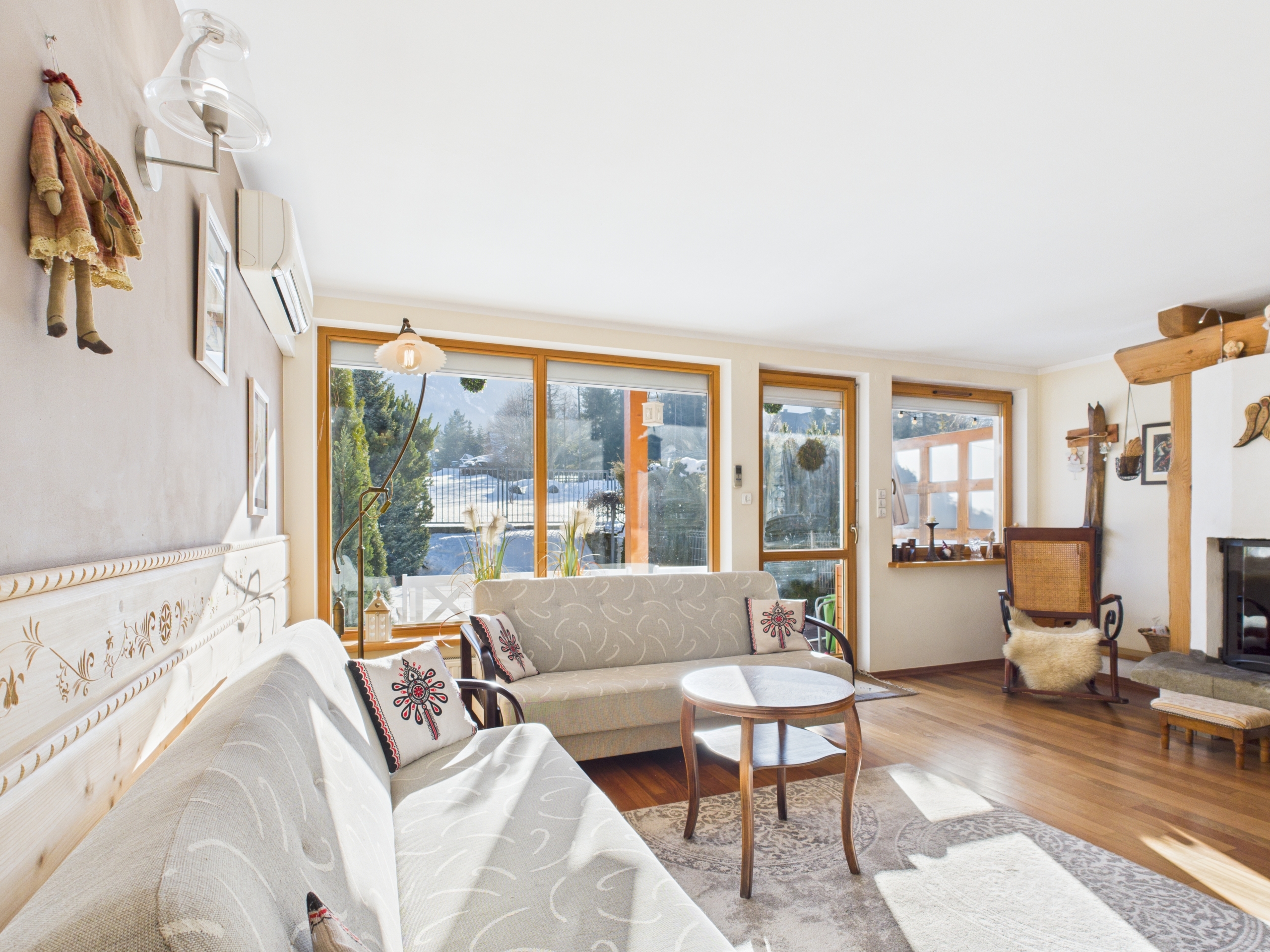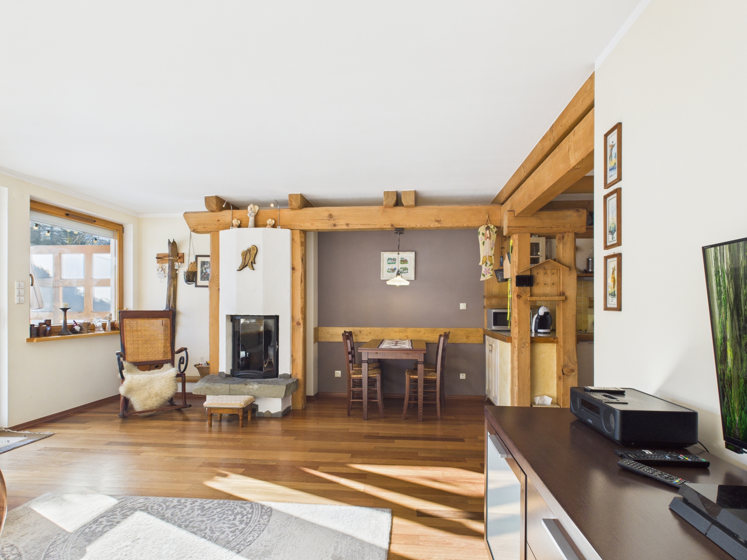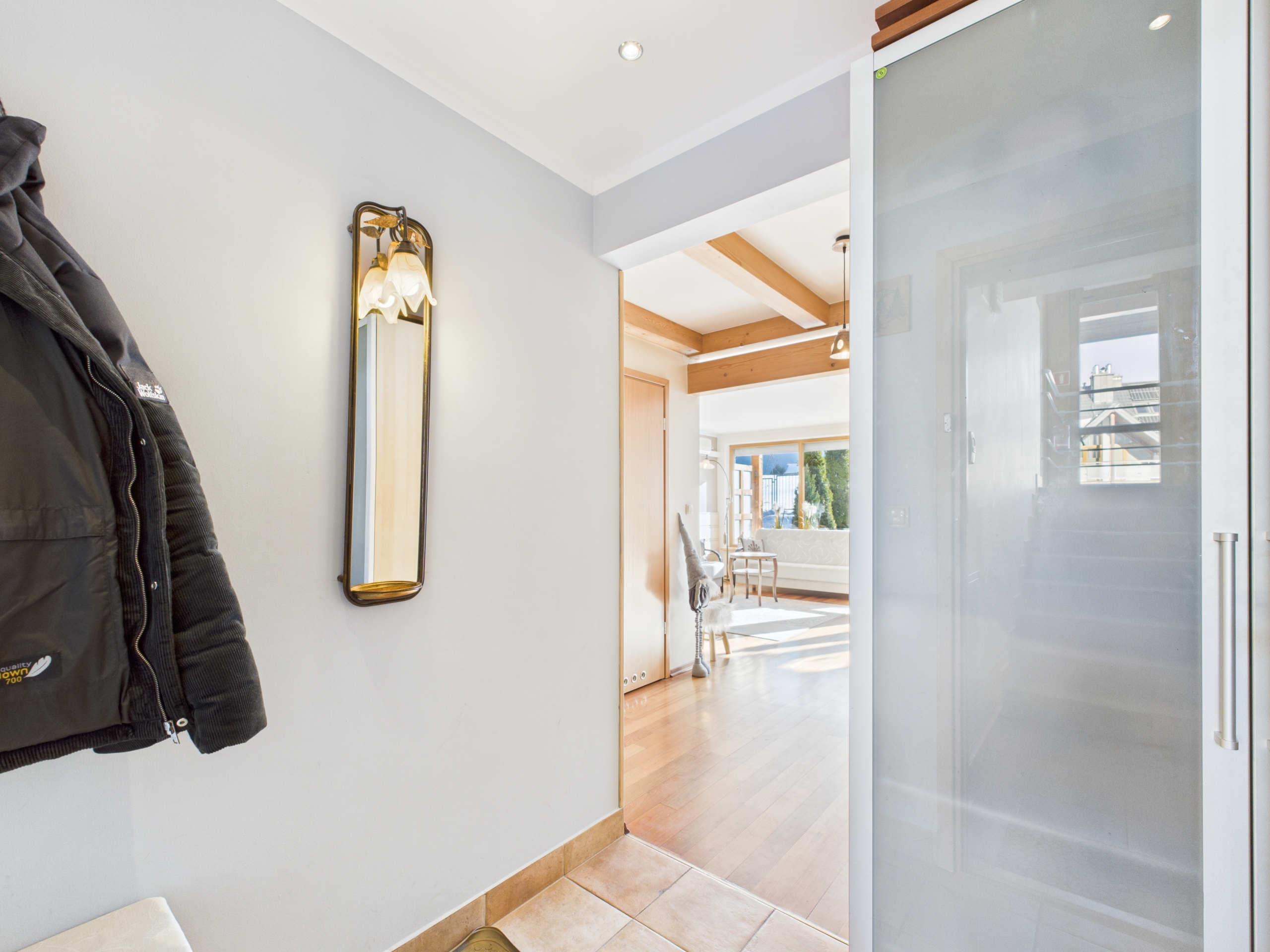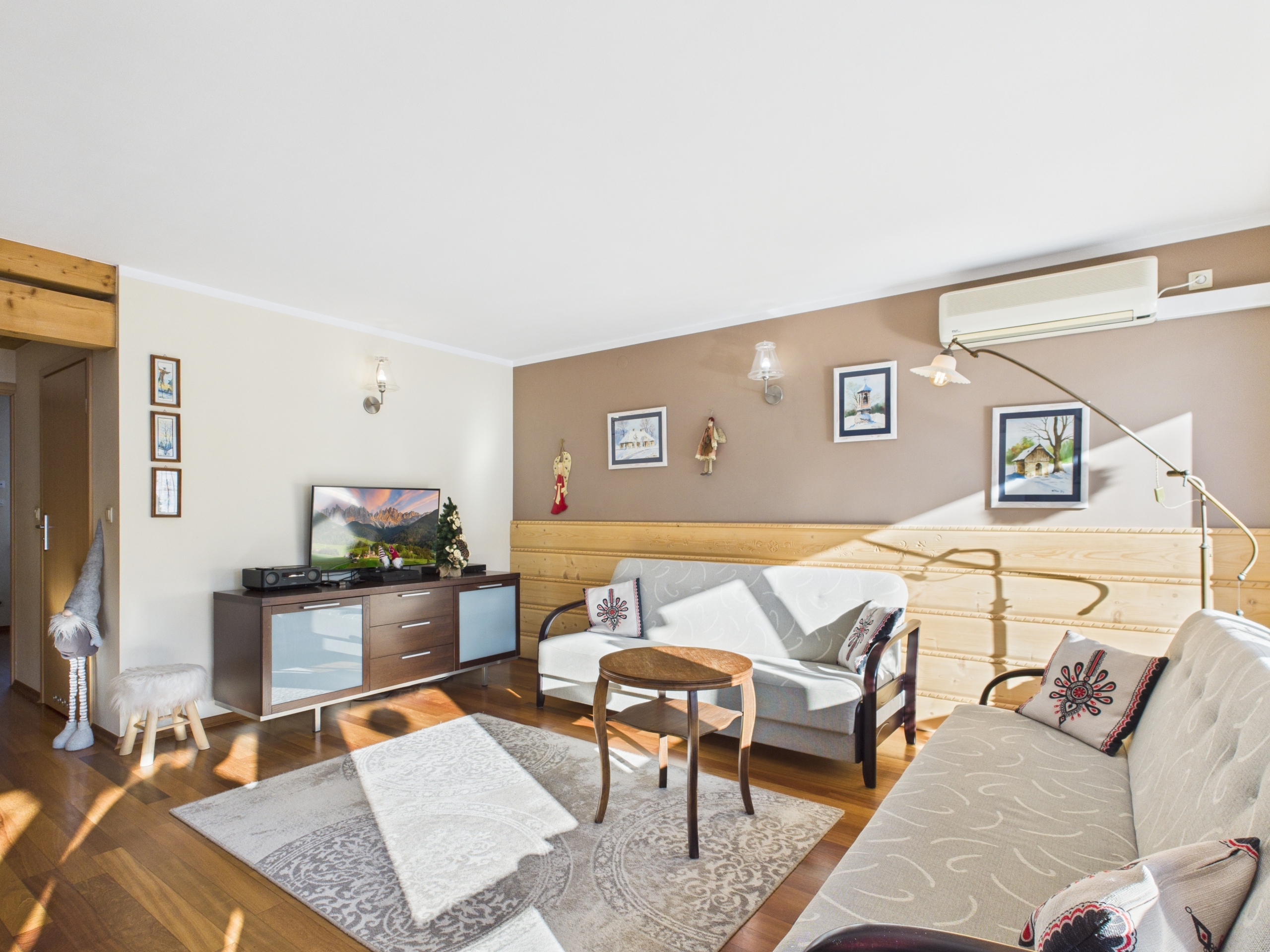 Apartament o powierzchni 52,63 m² z prywatnym ogródkiem o powierzchni ok. 70 m² oraz widokiem na Giewont. Wnętrze wykończone w stylu zakopiańskim – drewniane podłogi oraz elementy z naturalnego drewna, wykonane na zamówienie przez lokalnego artystę, Pana Giewonta, nadają całości wyjątkowy, regionalny charakter.