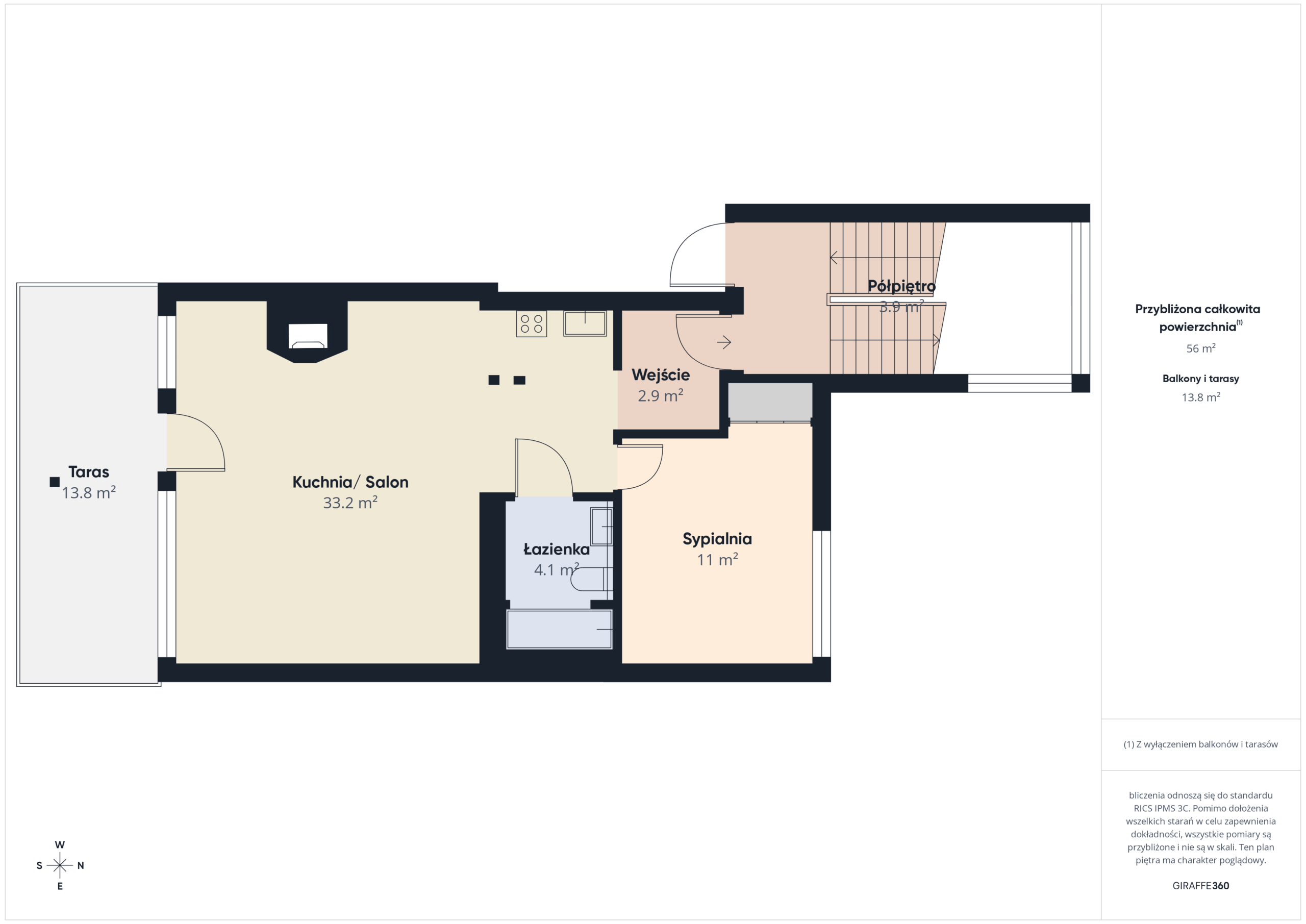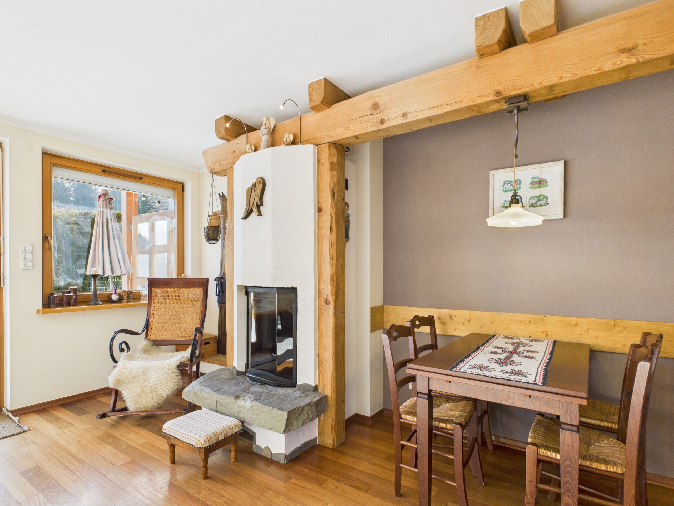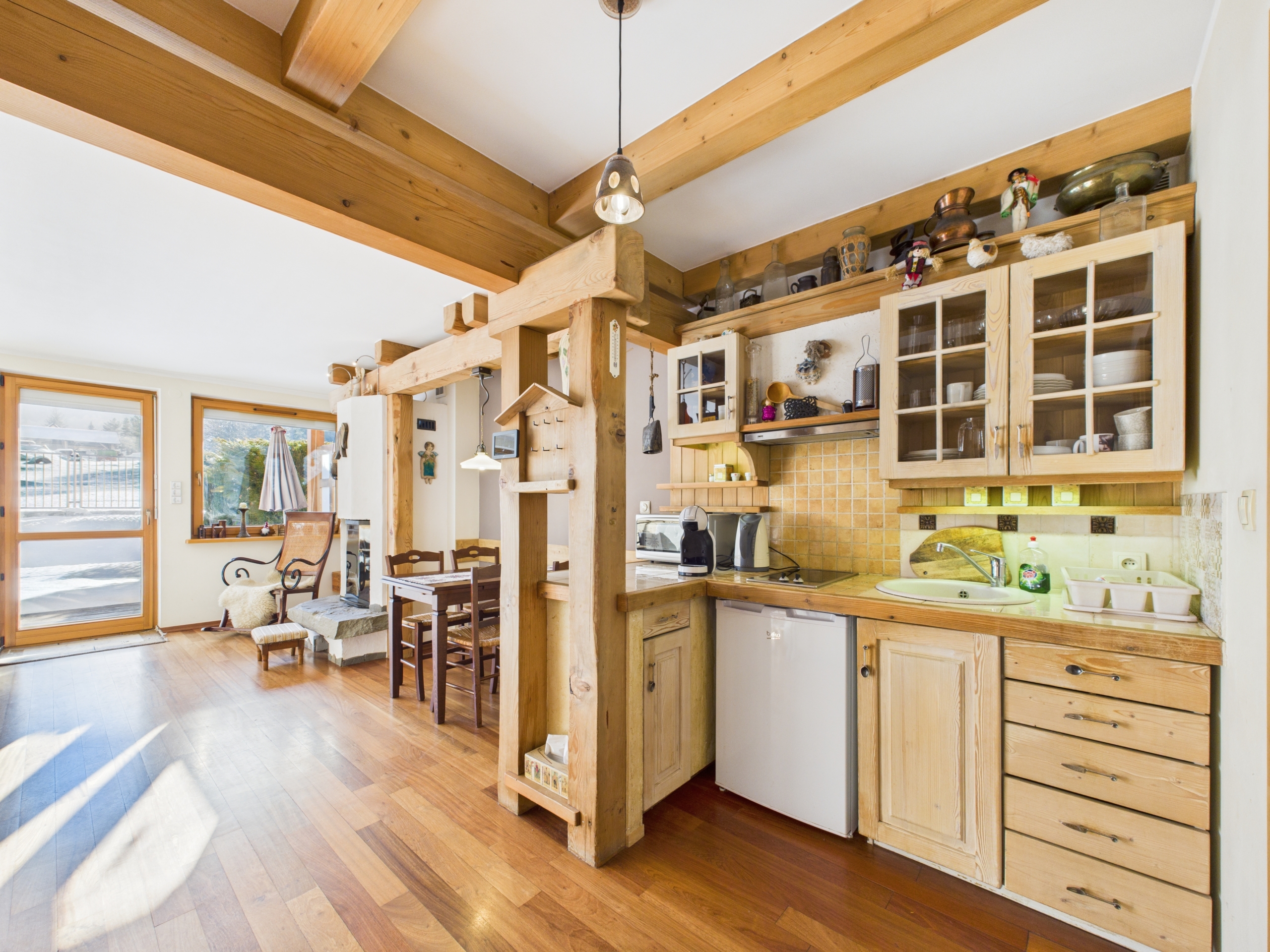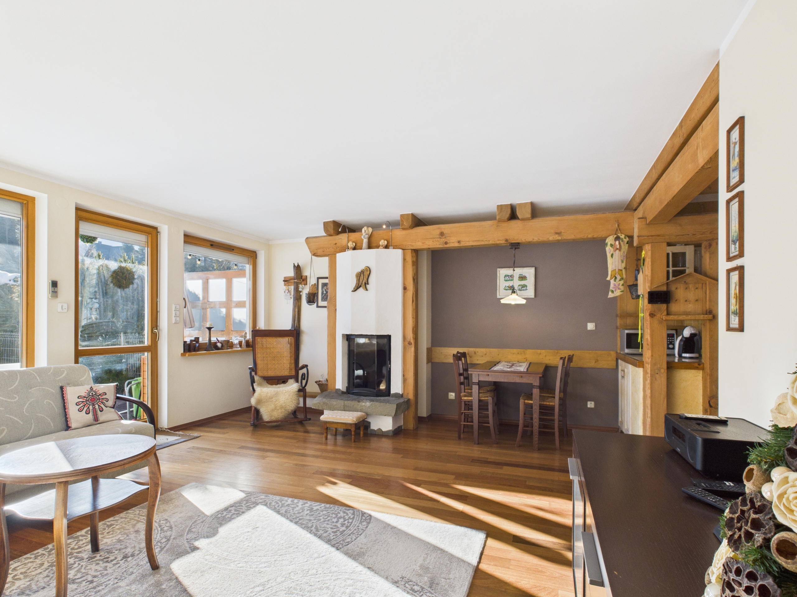 Apartament o powierzchni 52,63 m² z prywatnym ogródkiem o powierzchni ok. 70 m² oraz widokiem na Giewont. Wnętrze wykończone w stylu zakopiańskim – drewniane podłogi oraz elementy z naturalnego drewna, wykonane na zamówienie przez lokalnego artystę, Pana Giewonta, nadają całości wyjątkowy, regionalny charakter.